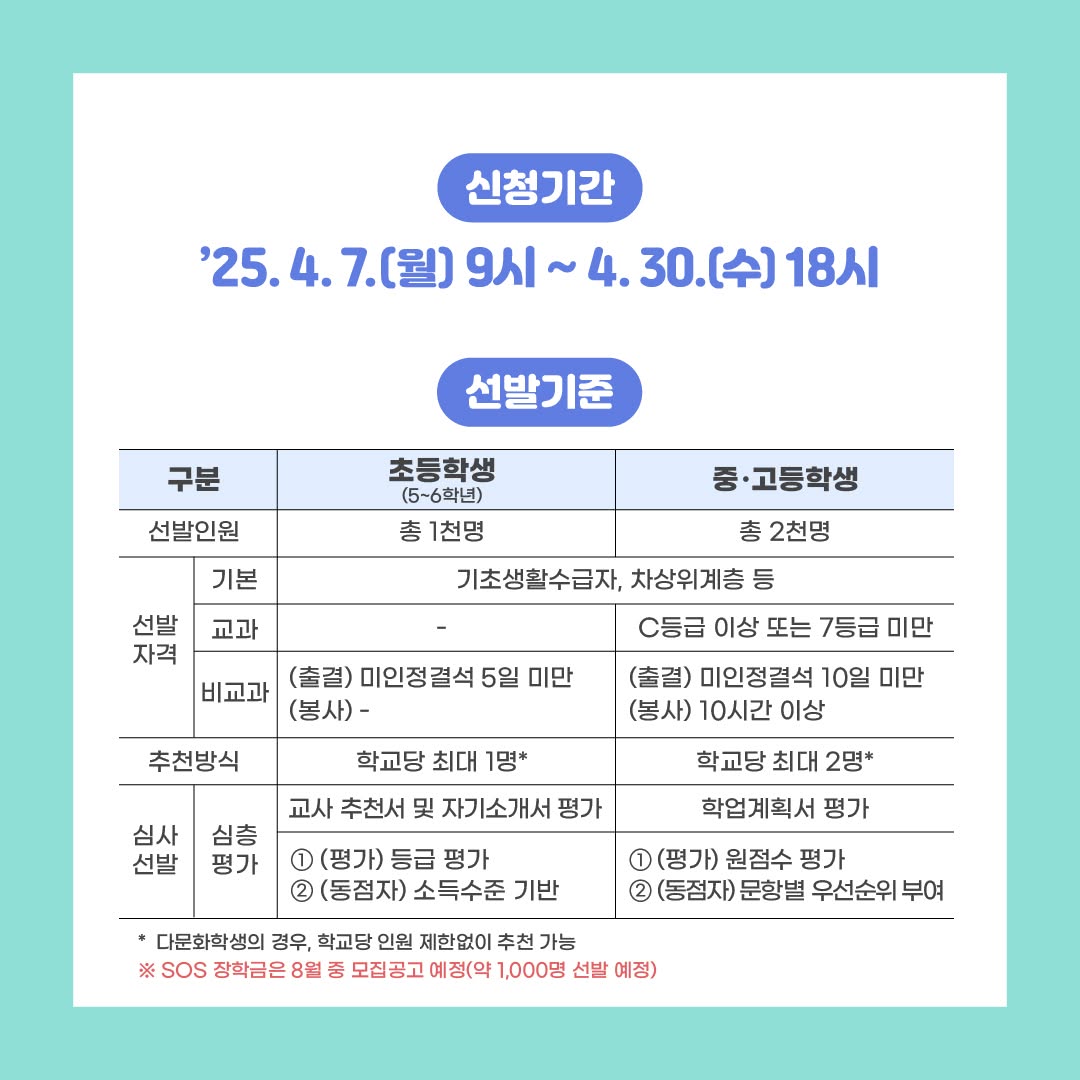 - 중학생 및 고등학생 중에서 학업 성적이 우수하고, 가정 형편이 어려운 학생
